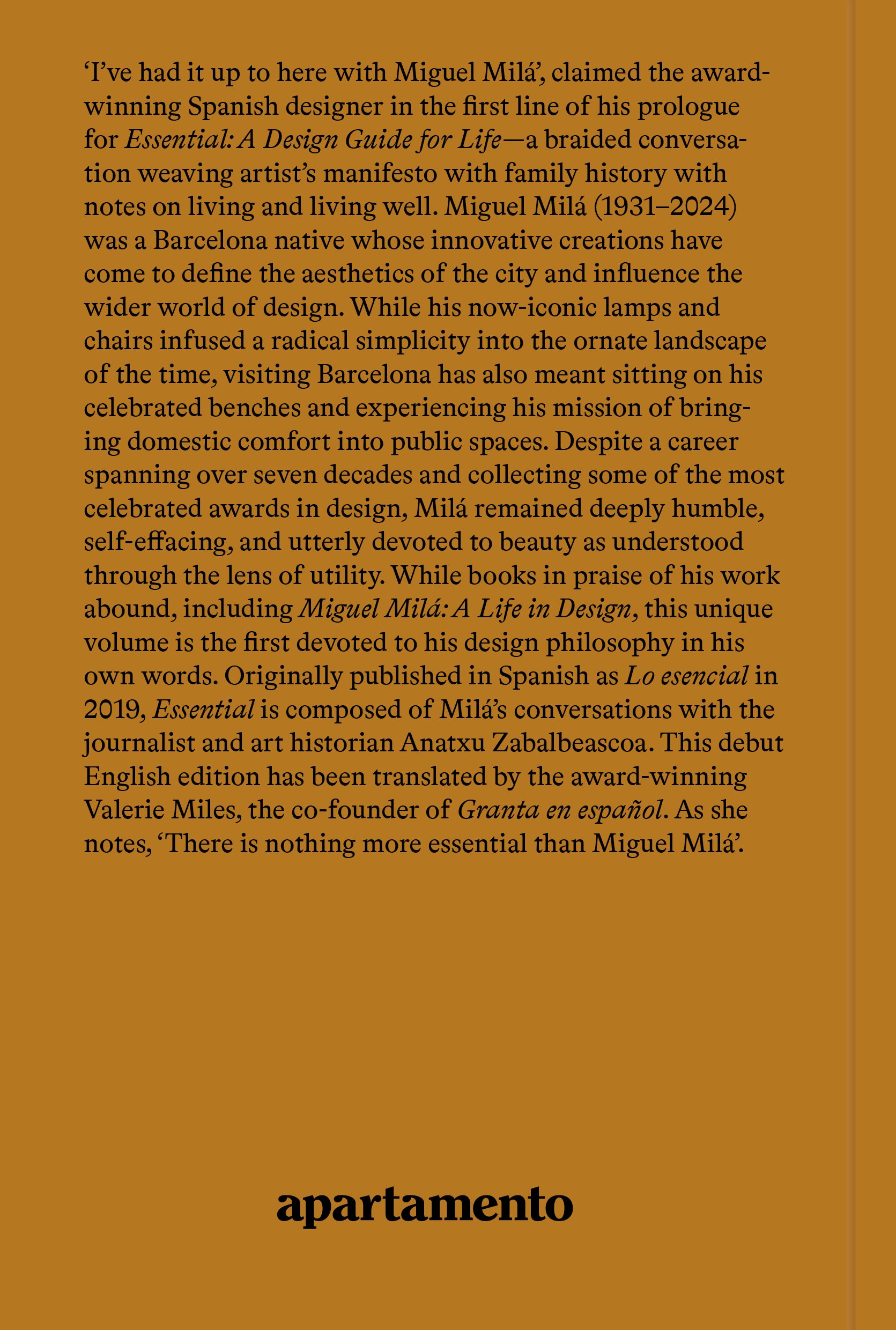 Essential: A Design Guide for Life by acclaimed Spanish designer Miguel Milá (1931–2024) is a braided narrative weaving artist manifesto with family history with notes on living and living well. Originally published in Spanish as Lo esencial to much success in 2019 and translated into English by the award-winning Valerie Miles, Essential is the very first volume in our new series of reading books, focusing on the ideas and reflections of renowned creatives. While books in praise of his work abound, including Apartamento’s own Miguel Milá: A Life in Design, this unique volume is the first devoted to his design philosophy in his own words.